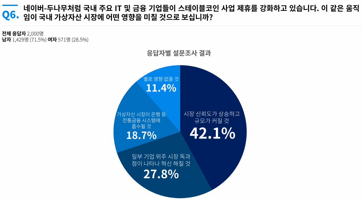 코인니스와 크라토스가 공동 진행하고 있는 주간 국내 투자자 시장 동향 정기 설문조사에 따르면 응답자 42%(전주 36.7%)가 다음 주 비트코인이 상승 혹은 급등할 것으로 전망했다. 횡보를 예상한 응답자는 34.6%(전주 35%), 하락과 급락을 예상한 응답자는 23.4%(전주 28.3%)를 차지했다. 시장 심리를 묻는 질문에는 가장 많은 39.9%가 중립이라고 답했다. 낙관 혹은 극단적 낙관이라고 답한 비중은 36.5%, 공포 혹은 극단적 공포라고 답한 비중은 23.6%로 집계됐다. 네이버파이낸셜과 두나무의 '빅딜'(포괄적 주식교환) 및 스테이블코인 협업 강화가 국내 가상시장에 미칠 영향을 묻는 질문에는 가장 많은 42.1%의 응답자가 '시장 신뢰도 상승 및 규모 확대'를 선택하며 긍정적 영향을 내다봤다. 이어 27.8%는 '소수 기업의 시장 독과점으로 혁신 저해', 18.7%는 '전통 금융의 가상자산 시장 흡수 본격화', 11.4%는 '별로 영향 없을 것'이라고 답했다.